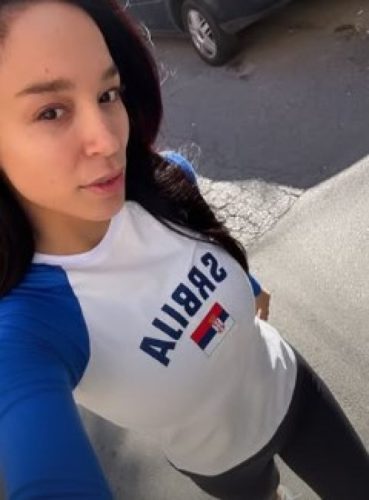 На сликата, пејачката позира на дневна светлина, облечена во лежерна комбинација — маица со натпис „Србија“ и црни хеланки.