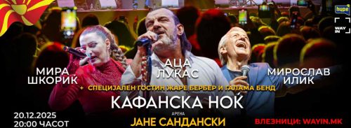 Арената „Јане Сандански“ во Скопје на 20 декември 2025 година ќе биде место на вистинска музичка магија, емоции и незаборавна атмосфера! Публиката ќе има прилика да ужива во „Кафанска ноќ“ – спектакл кој ќе ги собере најголемите легенди на народната и забавната музика: Аца Лукас, Мирослав Илиќ и Мира Шкориќ.