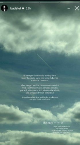 „Среќен сум што конечно го напуштам Париз… и нацијата со најлошо однесување во светот“ – напиша тој на неговата Инстаграм приказна.